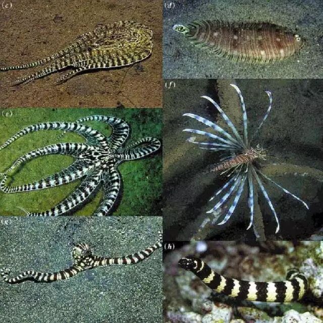 章鱼的拟态:左侧为“变身”后的章鱼,右测为它模仿的其他海底生物