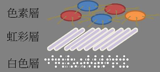 最上面的色素层有很多色素囊,每一个色素囊周围都有一圈肌肉,只要肌肉一起用力收缩,小的色素点就被拉成很大片的色块。中间的虹彩层则是由细胞水平排列成很多薄层,在神经讯号刺激下,透过调整角度和厚度,反射、偏振出很像亮片的光泽。最底下的白色层最简单,就是细胞里有超白的反光蛋白(reflectin),可以几乎反射所有可见光。