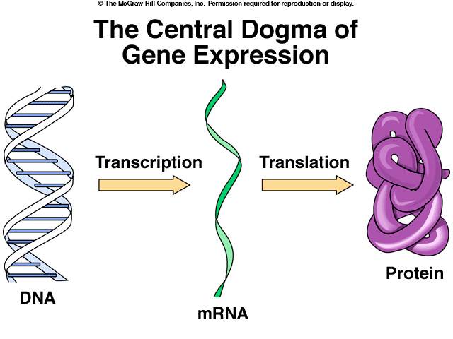 中心法则:DNA转录(transcription)成RNA,然后RNA翻译(translation)成蛋白质(protein)