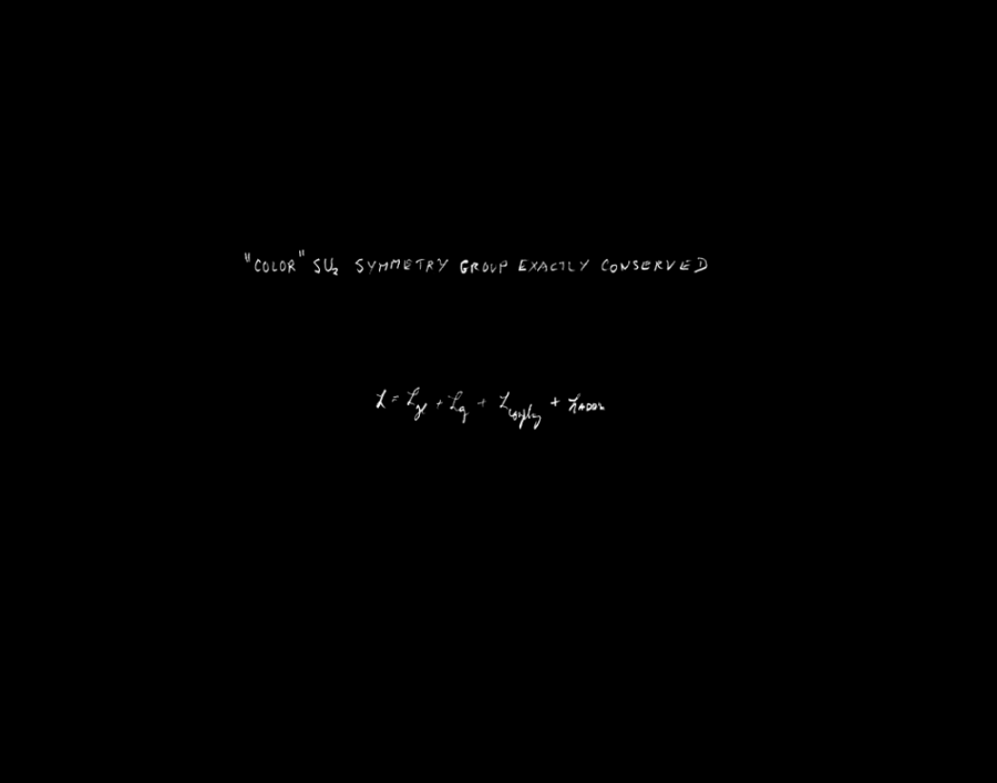 这里的表达式给出“量子色动力学(QCD)”的拉格朗日密度,它用数学表达式概括了强相互作用的动力学。强相互作用同引力、弱力、电磁力一样,都是自然界中基本的力。此表达式美在寓真实于其中。它还美在简洁,不过是做了一点清理之后的简洁。这里有三项,前两项Lgt、Lq 分别包含胶子、夸克的贡献(场),Laddl  包含“附加”项,其中部分的场最终预言了近期才发现的希格斯玻色子。