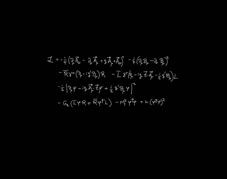 电弱理论是一种场论,它的基本成分是场,其中也包括电场和磁场。方程左侧的L由场及场的变化率组合而成,称为此理论的拉格朗日密度。拉格朗日密度是像能量密度那样的东西,根据物理学家从二十世纪三十年代就开始使用的规则,理论中各种场所遵循的方程都方便地蕴含在拉格朗日密度之中。