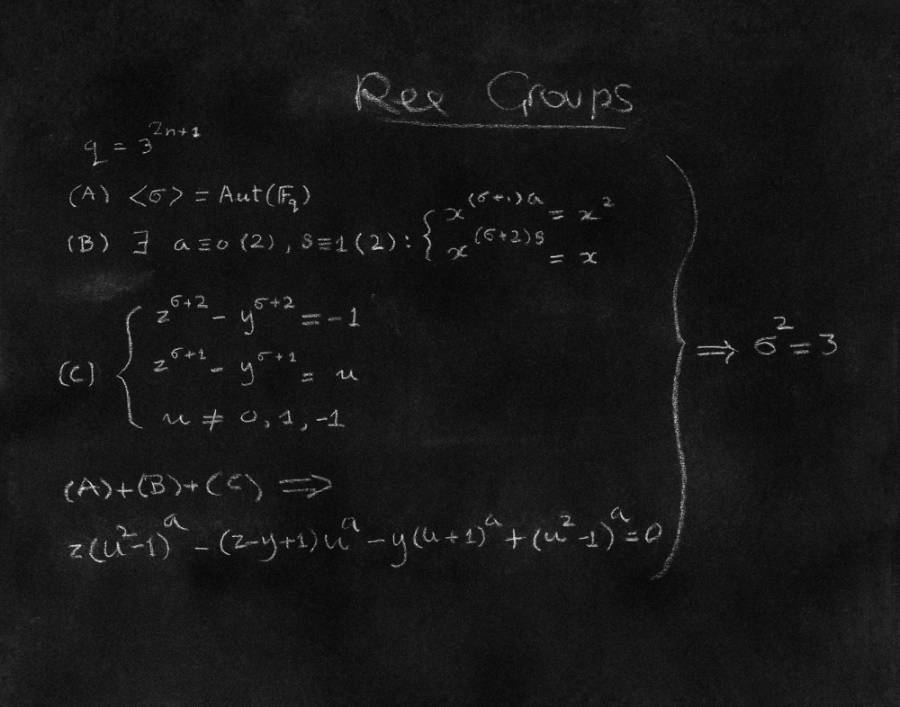 这个等式是用白色粉笔写在暗蓝灰色的黑板上,左边是汤普森等式,双箭头指向σ2=3,意指左边的等式蕴含了twisted Ree群的唯一性。问题很漂亮,而所期待的解答也很简单,因而优美,汤普森等式具有内在隐秘的美,因为它反映了一个群的性质。对专家来说,避开蛮力而得到的解答也具有其自身的美。事实上,数学家在追寻其真理时——有时是自动地——以寻求美为向导。正如诗人济慈(Keats)所说,美即真,真即美。