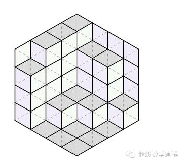 1989 年的《美国数学月刊》(American Mathematical Monthly)上有一个貌似非常困难的数学问题:下图是由一个个小三角形组成的正六边形棋盘,现在请你用右边的三种(仅朝向不同的)菱形把整个棋盘全部摆满(图中只摆了其中一部分),证明当你摆满整个棋盘后,你所使用的每种菱形数量一定相同。