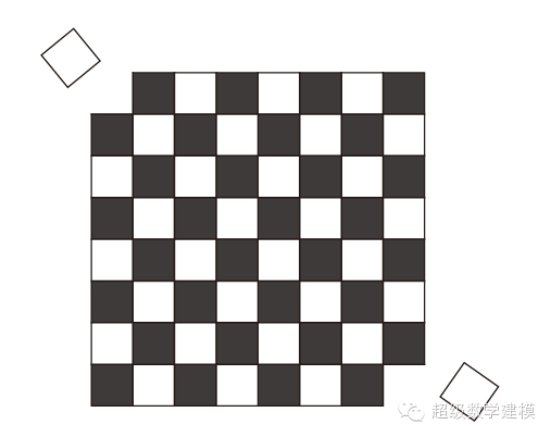 答案是不能的。每一张骨牌在棋盘上必是覆盖住两个相邻方格,一白一黑。所以31张骨牌应该可以盖住31个黑格和31个白格。而这被切了角的棋盘上的方格有32个是一种颜色,另一种颜色是30个,因此是不能被31张骨牌覆盖的。