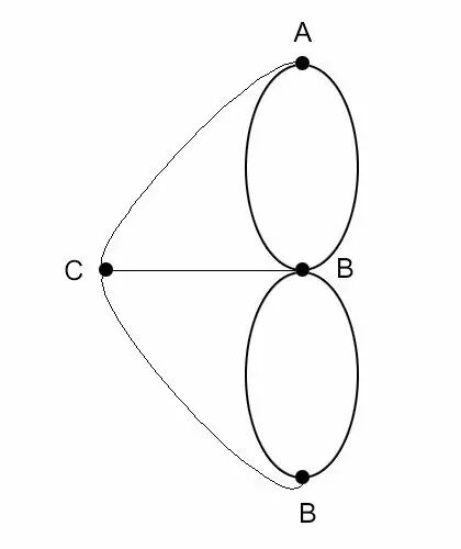 爱好思考的哥尼斯堡人民开始了各种探索,这个数学题看起来非常简单,但是并没有任何人提出解决方案。有人写信向当时著名的数学家欧拉(Eu-ler,1707~1783)求教,就是那个视力极差的伟大天才,统治着18世纪的数学界,他收到求教信以后,半天就想出了7×6×5×4×3×2×1=5040(种)办法。不过天才就是天才,他认为不能这样呆笨地试下去,得想别的方法,并且产生了一种直觉的猜想:许多人千百次的失败,是否意味着这样的走法根本就不存在呢?于是欧拉把这个问题进行数学抽象,把它转化为下面的网络图。
