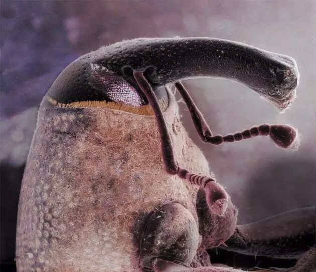 象鼻虫的头 这张棉铃象鼻虫(Anthonomus grandis)的头部细节照片是2015年惠康图片奖的获奖作品之一。拍摄者利用扫描电镜记录下了棉铃象鼻虫只有几毫米宽的头部。