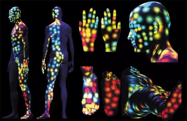皮囊之上 这些图像反映了人体最大的器官——皮肤上的化学物质和微生物分群。研究者从两名健康成人志愿者身上的400个位置上取得拭子,为了完成采样,两人坚持了三天没洗澡。