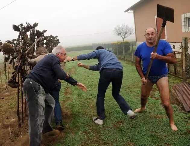 “这张照片拍下了法国鸟类保护联盟的主席和Audon当地一位农民的交火现场。我们没有把它选进年度最佳.....为啥奥斯卡最佳图片奖不喜欢搞笑图片呢?也许我们可以问问举着铁锹的这位。”