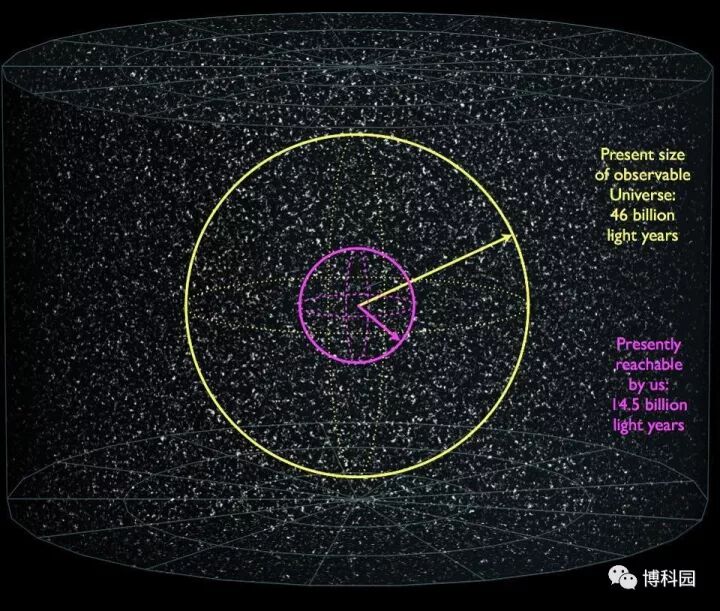 在可观测的宇宙中(黄色圆圈),大约有2万亿个星系。由于宇宙的膨胀,我们所能观测到的宇宙边界的三分之一以上的星系都无法到达,只留下3%的宇宙空间对人类的探索“开放”。