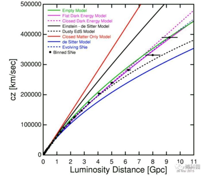 2、红移/距离关系将在很大距离上服从一个非常特殊的形式,这与扩大的空间结构是不同的