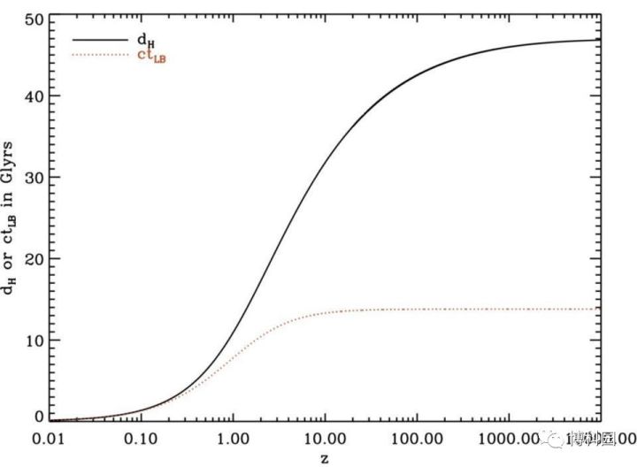 对红移/距离(虚线)和广义相对论(固体)的解释在膨胀的宇宙中距离的解释。最后,只有GR的预测与我们观察到的相符。图片版权:Wikimedia Commons user Redshiftimprove