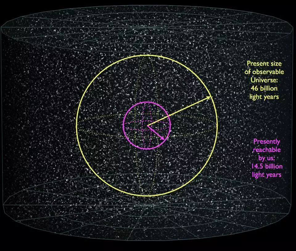 在可观测的宇宙内(图中黄圈内),有大约2万亿个星系。由于宇宙的膨胀,我们只能探索