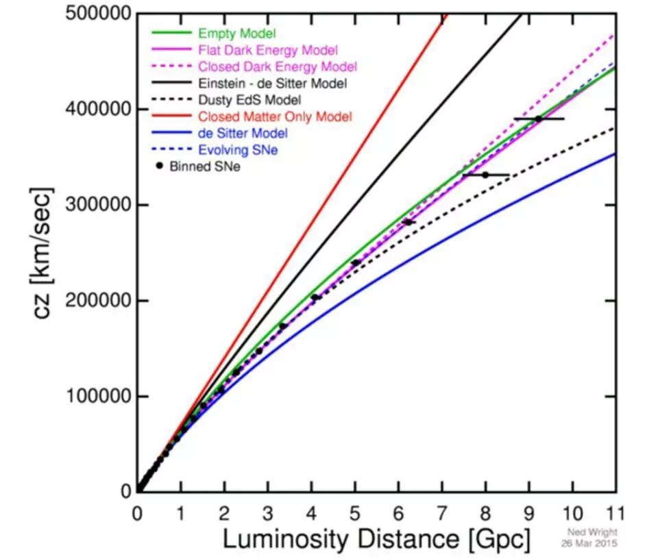 距离与膨胀速度的关系。过去的膨胀速度较高,现在宇宙仍然在膨胀着。它们之间不是线性关系,意味着膨胀速度会随着时间变化。