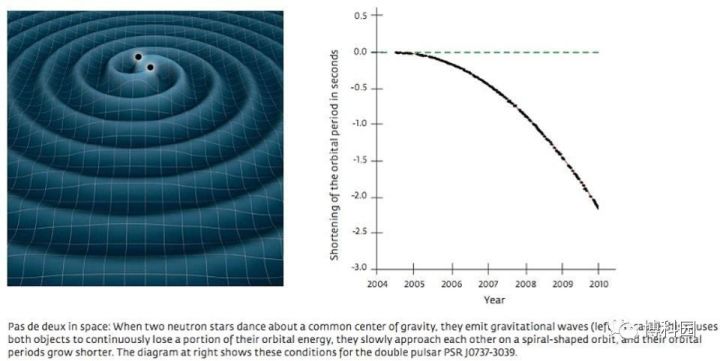 另外就是引力波的间接证据来自于脉冲星——快速旋转的中子星和环绕其他中子星。当这两个紧密的物质围绕着彼此旋转时,它们的周期就会衰减,那么能量到哪里去了?事实证明引力波是即能量被带走的证据。