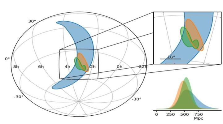 GW170814的国源在天空的定位。图中左边的部分比较了不同分析选择的天空区域,因为它们最有可能包含了GW170814信号的来源,三个重叠区域给出了最可能的位置。图片版权:The LIGO Scientific Collaboration and The Virgo Collaboration