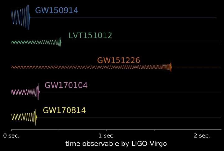 这个图显示了LIGO和室女座的四个自信和一个候选(LVT151012)引力波信号的重建,包括最近探测到的GW170814(在三个探测器中都观察到)。图片版权:LIGO/Virgo/B. Farr (University of Oregon)