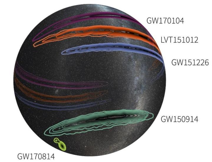 非常令人印象深刻的是在LIGO探测器观测到的信号之后,室女座探测器的信号仅到达6毫秒。在这些探测器之间的很长的基线,在美国和处女座在一个完全不同的大陆上,在一个大洋上允许在信号的位置上有一个从未有过的狭窄的位置。