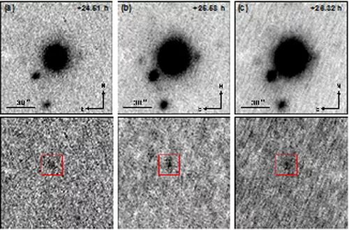 “千新星”的理论最早由李立新教授和Paczyński教授在1998年提出[7],研究指出,致密天体(如中子星)在相互旋进与并合时,将会有近似各向同性的富中子化物质抛射,通过快中子俘获过程,这些抛射物能够合成大量重元素,而重元素的衰变则会加热抛射物,使其发出可观的可见光与近红外辐射,这种现象将如同超新星一样,但持续时间较短。这种现象被称为“李- Paczyński巨新星”。后续的研究指出,这种现象比超新星亮度更低,但其亮度大约可达新星的1000倍[8],故而又被称为“千新星”。2013年,英国天文学家首次通过HST对短伽马射线爆GRB130603B的余辉的观测发现了巨新星的迹象[9]。