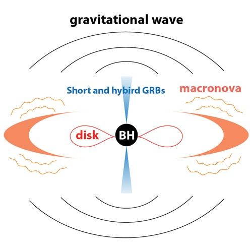 短暴或长短暴、引力波信号、巨新星信号的关联性示意图