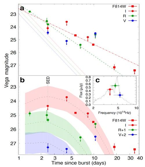 (a) GRB 050709的光学辐射;(b) GRB 050709光学辐射扣除余辉成分后留下的“奇异”信号与“中子星黑洞并合模型预期的巨新星辐射”的比较;(c) 2.5天处的“奇异”能谱与一个巨新星模型预言的比较[12]。