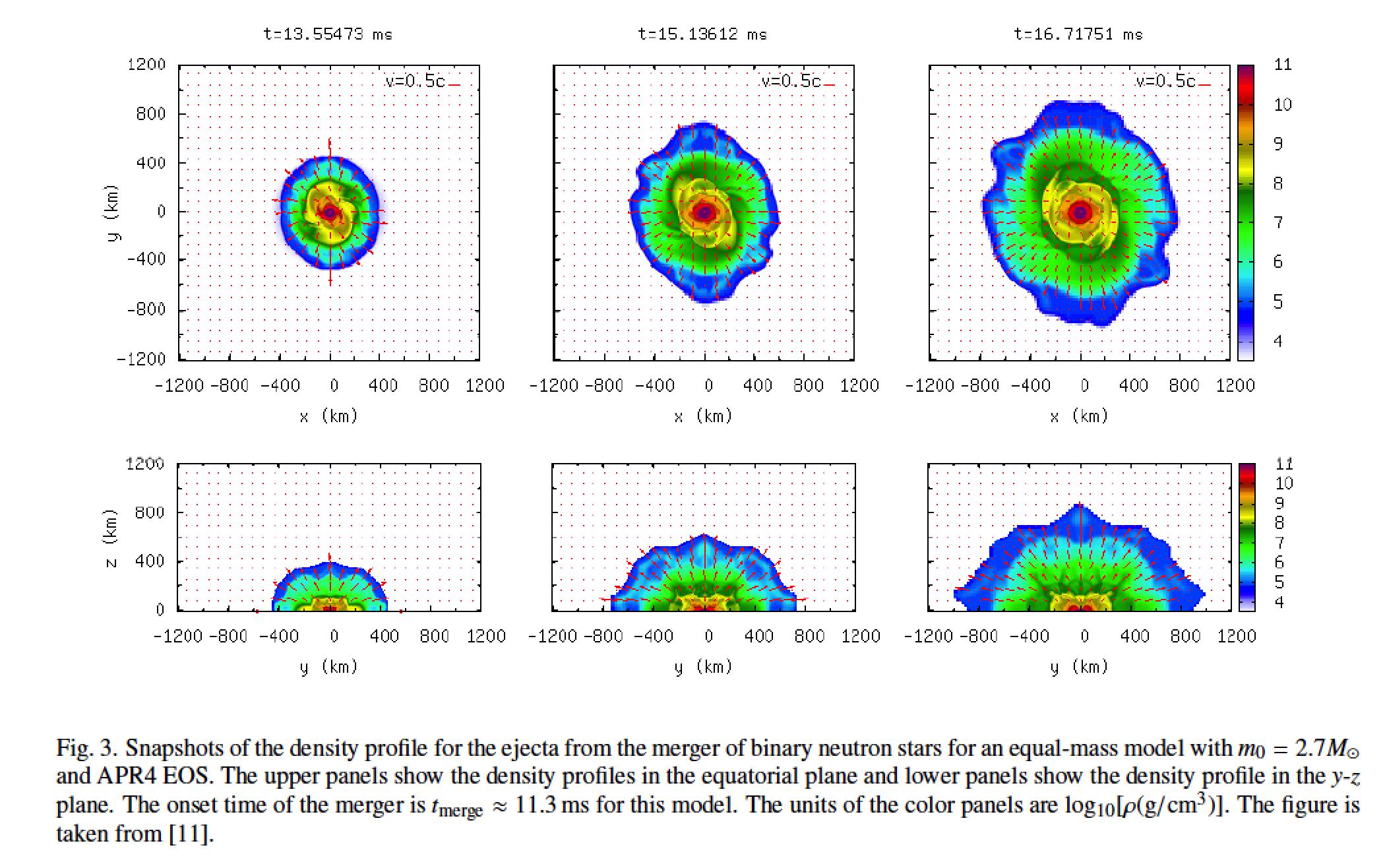 LIGO和VIRGO直接探测到中子星—中子星并合事件所产生的引力波,以及对中子星并合过程的研究,又有着怎样的科学意义呢?我们可以举些直观的例子。在前文中我们提到,一些碰撞过程中产生的碎屑会离开中心天体。这些碎屑质量约为太阳质量的0.001倍到0.1倍,速度则在光速的10%到30%之间[13]。这些碎屑会像超新星爆发那样以近球状溅射开来,并很可能作为快速中子捕捉过程(r-process)的发生地存在[7]。快速中子捕捉过程被认作是生成比铁元素更重的元素的重要来源:重核在放射性衰变尚未发生以前就捕获中子,从而生成更重的元素(如金、银等)。因此,对中子星并合过程及其喷射出的碎屑的研究,或许能一定程度解答原子序数大于56(铁)的元素如何生成这一难题。