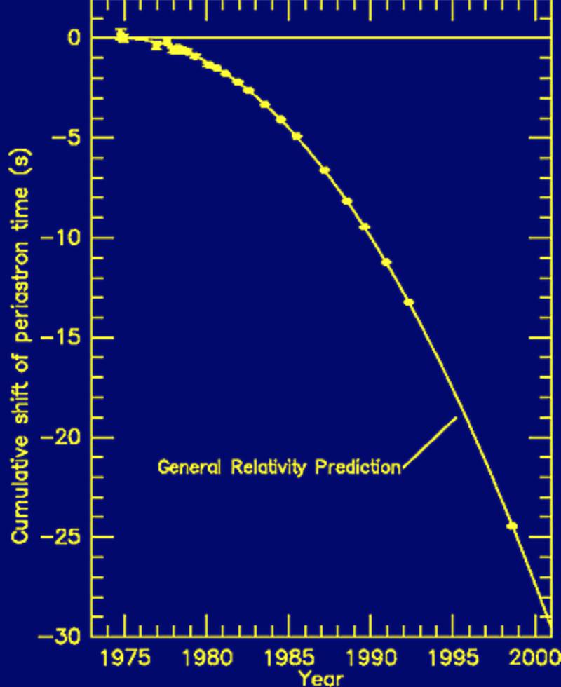 双中子星并合过程研究和引力波探测的渊源,早在几十年前就已埋下了种子。1974年,Russell Alan Hulse 和 Joseph Hooton Taylor, Jr. 利用305米口径的阿雷西伯望远镜共同发现了第一对中子星 (Neutron Star pair) PSR J1915-1606 [3]。PSR J1915-1606S是一对在射电波段有周期性脉冲辐射的中子星—脉冲星。观测结果显示,这两颗质量约为1.4太阳质量的脉冲星轨道周期约为3秒,其轨道直径有逐渐收缩的趋势。爱因斯坦的广义相对论曾预言,双脉冲星的运动如果释放引力波,将导致脉冲星到达近星点(类比于地球公转的“近日点”)的时机有些微的提前。事实上,由于引力场的存在,PSR J1915-1606在经度上平均每年将其近星点提前4度。这一发现被认为是引力波存在的间接证据。1993年,Russell 和 Joseph 于1993年因为发现这一中子星对,且对它进行了大量后续分析被授予诺贝尔物理学奖。评审委员会认为,这两位得奖者及其团队发现了一种全新类型的脉冲星,并为研究广义相对论提供了新的可能[4]。