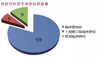 麦肯锡公司估计,在开发的生物类似药中,40%是单克隆抗体。2012年3月的数据显示,正在开发单克隆抗体生物类似药为73只,其中59只处于临床前研究阶段,5只处于Ⅰ期或Ⅱ期临床研究,9只处于Ⅲ期临床研究。