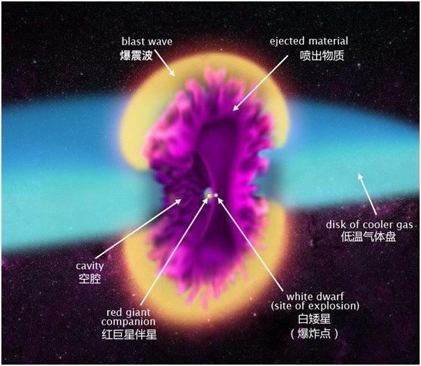 计算机计算结果表明,这场新星爆发的爆震波和喷出的物质很可能聚集在双星系统的南北两极。这种形状是由爆震波冲击双星周围的低温气体盘而造成的。这一相互作用使爆震波和喷出物质在盘的方向减速,并产生了一个不断扩张的、炽热的释放X射线的气体环。远离我们运动而去的物质产生的X射线绝大部分都被朝向地球运动的物质吸收和阻挡,这就解释了为什么看上去大部分物质都在朝向我们运动。