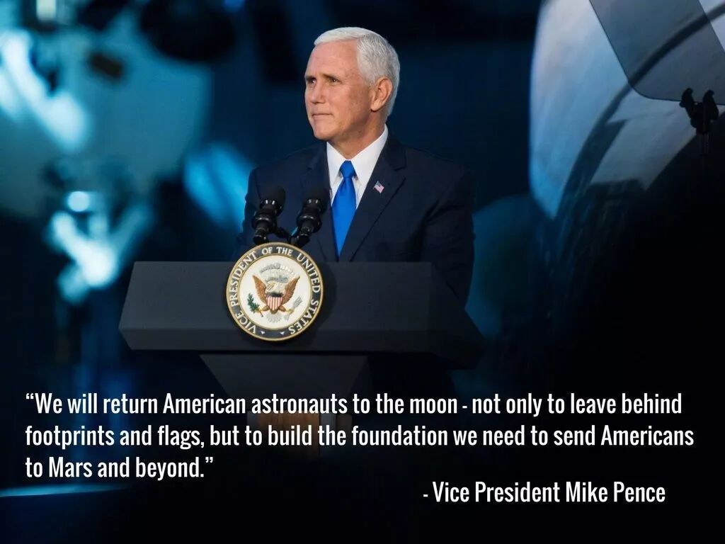 10月5日,在重组后的国家太空委员会(National Space Counci)首次会议上,美国副总统麦克·彭斯(Mike Pence)说:"美国宇航员将重返月球,不仅在那里留下脚印和国旗,而且为把美国人送往火星和更遥远的太空打下必要基础”。