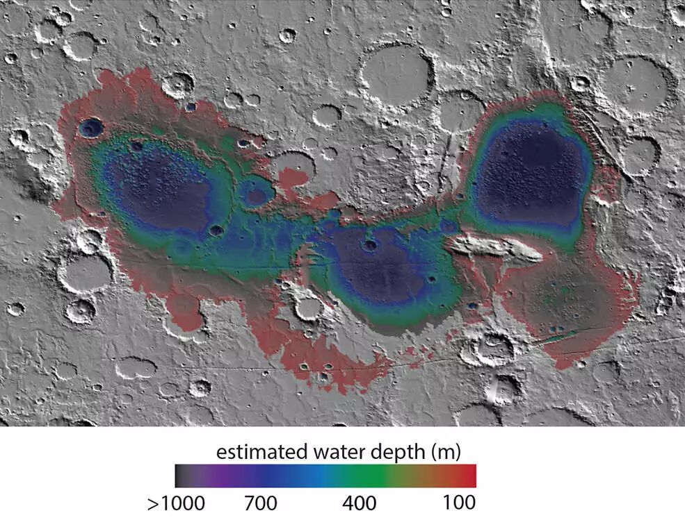 科学家认为火星南部的Eridania盆地在大约37亿年前曾经拥有海洋,海床沉积物可能是由于海底热液活动造成的。这幅地图显示了远古海洋估计的水深。地图覆盖了约530英里宽的区域。