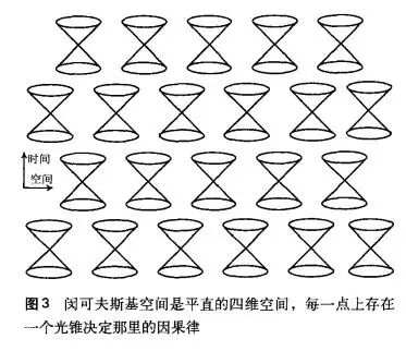 狭义相对论直到闵可夫斯基引人时空的概念才算完成,狭义相对论的时空是四维的闵可夫斯基空间,这个空间是平直的,在其中空间坐标和时间具有形式上的等价性。绝对时间的概念被放弃,时间不再是时空流型的基空间。由于存在光速作为速度上限,因此每一点可到达的物理空间由一个光锥所决定(图3)。可以把光锥看作是切空间中的结构,那里光锥被称为零锥(null cone)。零锥在切空间中是球形的,由方程gμνvμvν=0决定,其中vμ,vν是切空间中的矢量,gμν是闵可夫斯基度规。把有限光速当成基本的物理就是把光锥的结构当成基本的[6]。零锥决定狭义相对论中的因果律。