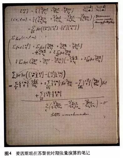 广义协变性要求物理定律在所有的参考框架内应该取相同的数学形式。对非惯性参考框架要求物理定律不变,其实就是要求(二阶微分方程形式的)物理定律对含二阶微分项的变换的某种不变性,即微分同胚协变性”。这是一个强的、绝对性的约束。这个不变性的要求以及要构造的引力论本质上是几何的理论决定了张量语言是合适的表达工具。爱因斯坦为此不得不花时间学习张量的数学(图4),试着在其上每一点狭义相对论都成立的洛伦兹流型上构造能描述引力的张量场。