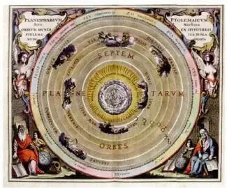 图五 (上)托勒密宇宙体系中天空是遥远的背景,右下角代表天穹的符号ћ是量子力学标志性的符号;(下)广义相对论关注宇宙大尺度的结构。