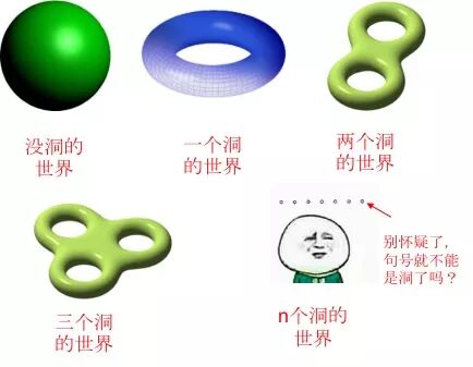从左到右分别称为,亏格(也就是“洞”的个数)=0,亏格=1,亏格=2,亏格=3。咦,最后面这个?看头上的省略号就好,它表示,罗克省略了其他亏格>3的情形。