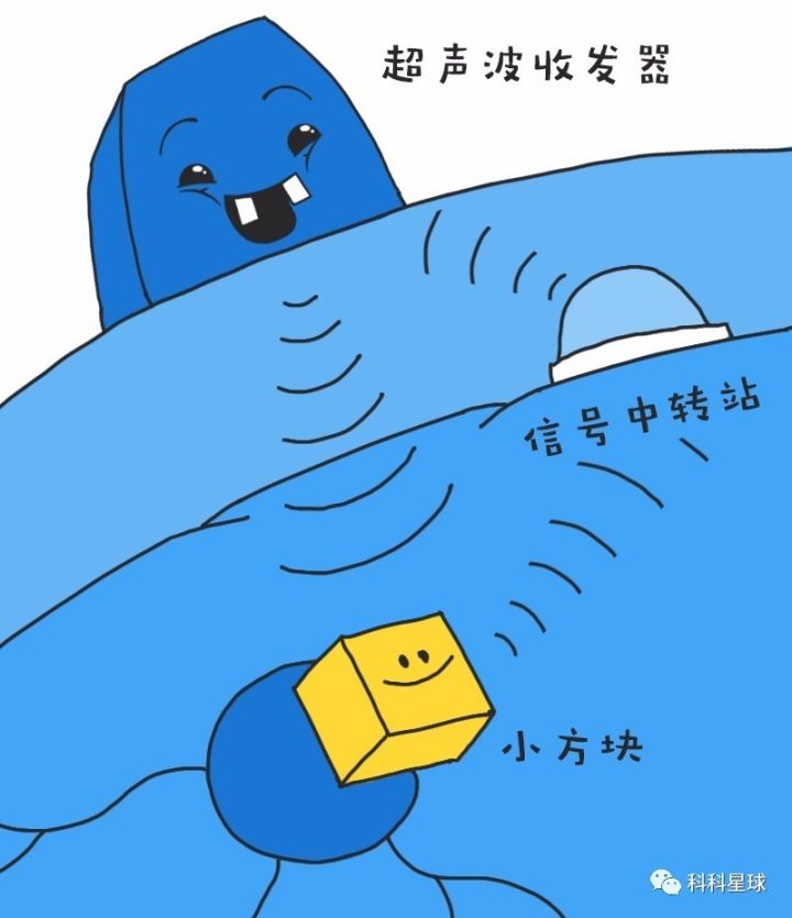 超声波收发器把超声波发射给小方块;小方块把一部分收到的超声波转化为电能给自己使用,然后把剩下的超声波反射到信号中转站;信号中转站再把超声波传回给超声波收发器。
