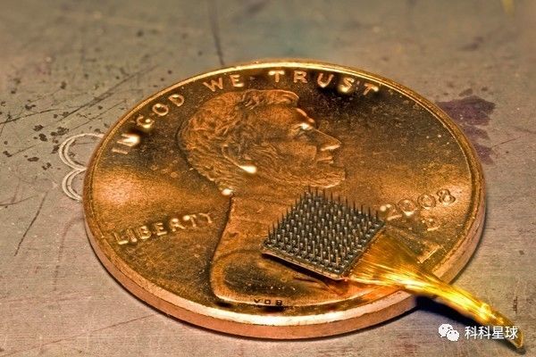 插入式技术就是像针灸一样把又尖又细的硅质电极戳进脑壳,收集电极周围所有神经元的信号。这项技术就像是一根麦克风吊在足球场里的一小群人上方,在狭小的区域内收集最精确的信息。不过,正常人真的不会想脑子上插一堆针走来走去吧。。。