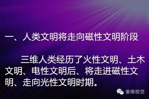 火性文明使我们告别了茹毛饮血的时代,土木文明使我们脱离野蛮,进入了植物性饮食阶段,电性文明是物质丰富的文明阶段(利己社会),磁性文明是物质与高频能量并存的文明阶段(德性社会),光性文明是高频能量的文明(利他社会)。