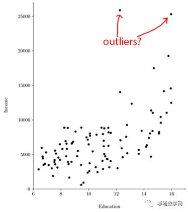 在上面的图中,那两点可能是异常值。你应该剔除它们,或者保留它们,或者可以剔除它们之一吗?没有正确的答案,你必须自己判断。
