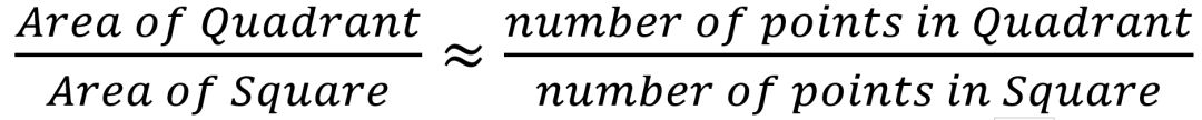 从蒙特卡罗方法的角度看,在1×1这个区间上可均匀地投放大量的点。这些点投到四分之一圆内的概率,近似等于投到四分之一圆内点的比例,即: