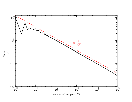 误差随着模拟次数的增加而不断下降,速率为N-0.5