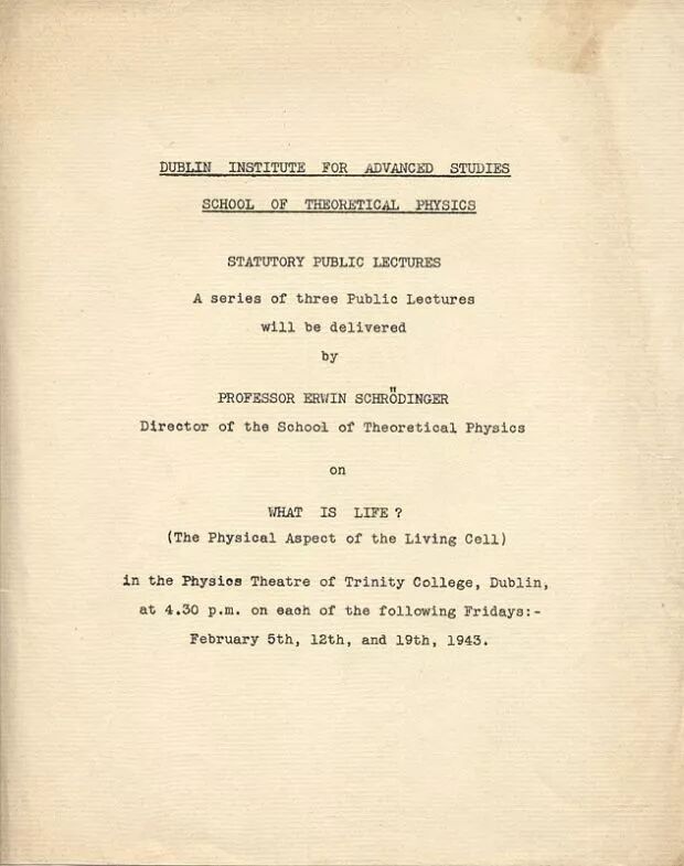 ○ 1943年,物理学家薛定谔在都柏林举办了一系列的讲座探讨了“什么是生命?”