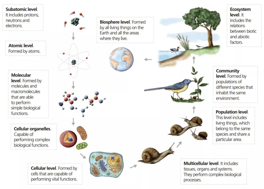 ○ 从分子生物学到生态学,都是生物学的研究对象。| 图片来源:Blinklearning