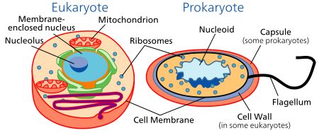 ○ 细胞分为两类:真核细胞(左)和原核细胞(右)。| 图片来源:Wikipedia