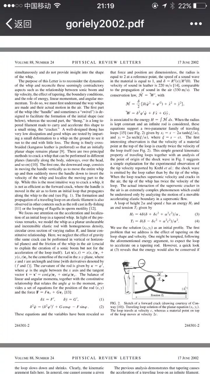 显然,这个模型是很粗糙的。因为在甩鞭子的过程中鞭子的动能没理由保持不变。而且,最后发出声音的部分究竟是末梢,还是中间部分,也存在很大争议。例如PRL上的这篇论文认为声音来源于鞭子中间形成的圆圈。