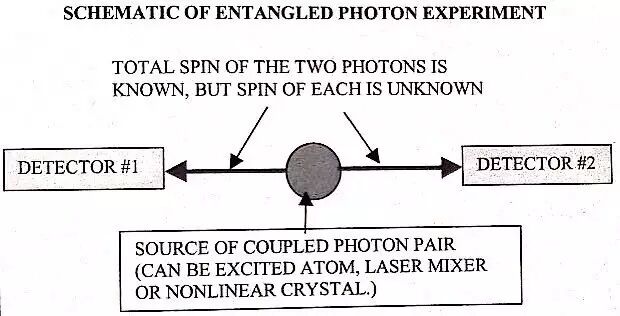 光子纠缠试验的简要描述。通过不同方法制造了两个光子的耦合态,所以光子对的总体自旋(或其他参数)是已知的,但每个光子的自旋是未知的。光子会从它们的混合点往不同方向上传播。当其中一个被检测器#1检测到后,那么它的自旋状态就会已知。那么另一个光子的自旋就会立即已知,不论它有多远。