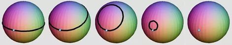 如下图所示,把一个橡胶圈套在一个封闭的甜甜圈上, 无论怎么样, 我们也不能让这个橡胶圈缩到一点去。所以这个像甜甜圈一样的面是不同胚于球面的,这与我们的常识是一致的。