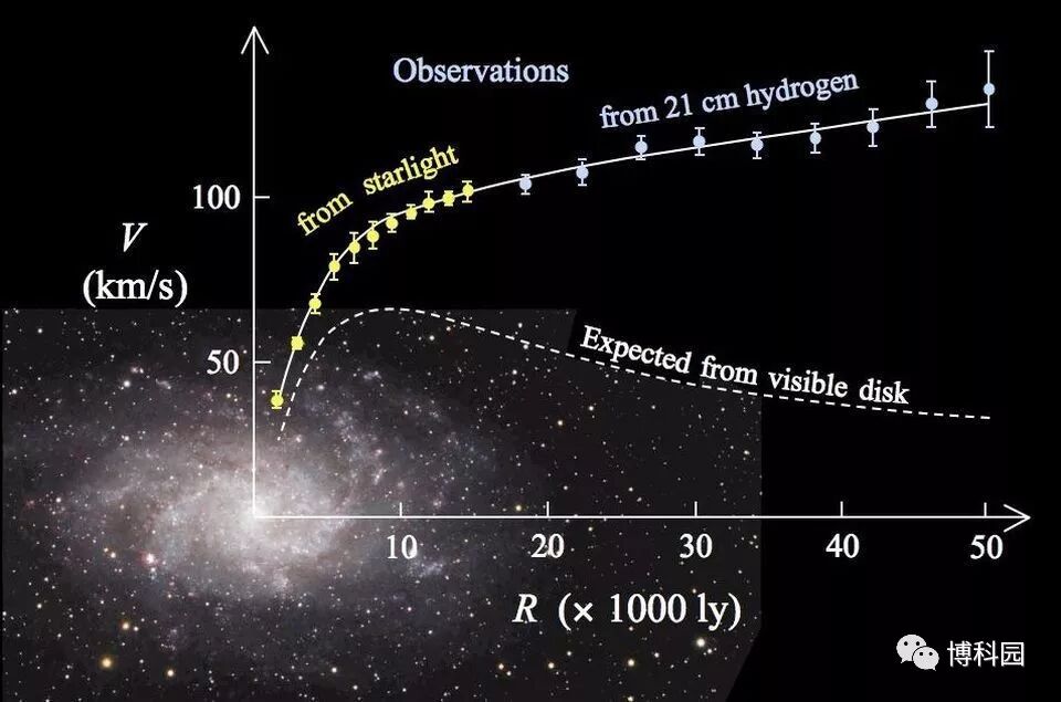 (图10)三角形星系M33的延伸旋转曲线,这些旋涡星系的旋转曲线将现代天体物理学的暗物质概念引入了一般领域,NGC 1052-DF2非常接近虚线所示的曲线,表明缺少暗物质。