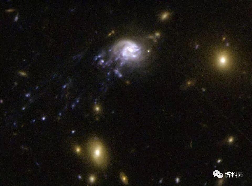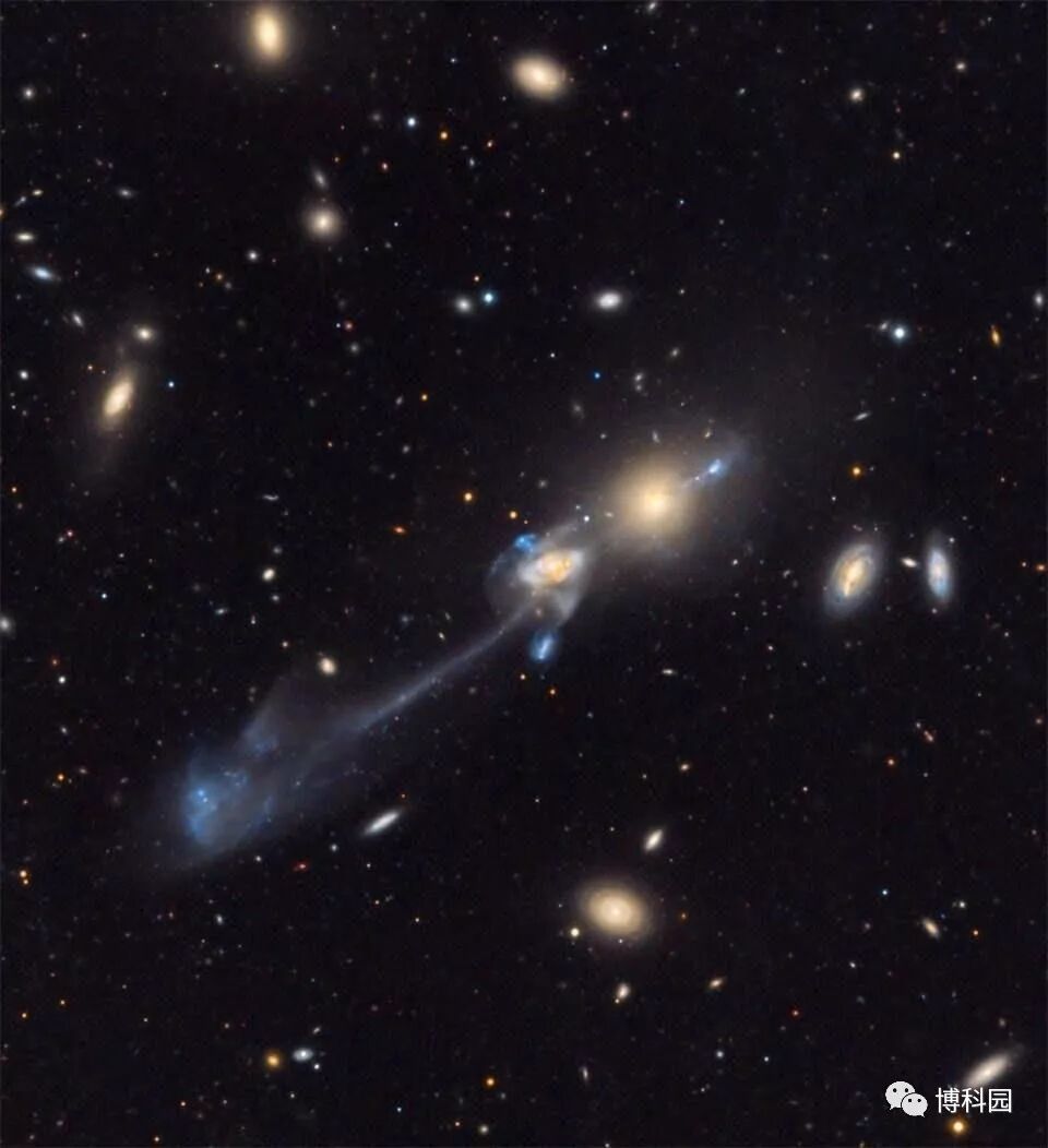 (图5)NGC 3561A和NGC 3561B相互碰撞并产生巨大的恒星尾,羽状物,甚至可能是“喷射物”,这些物质凝结而成为微小的“新”星系。炽热年轻恒星发出蓝色的光芒,那里是新恒星诞生形成的地方,作为大型星系团的一部分,这种喷射物质可能导致形成一个与天文学家今天所看到DF2非常相似的星系。
