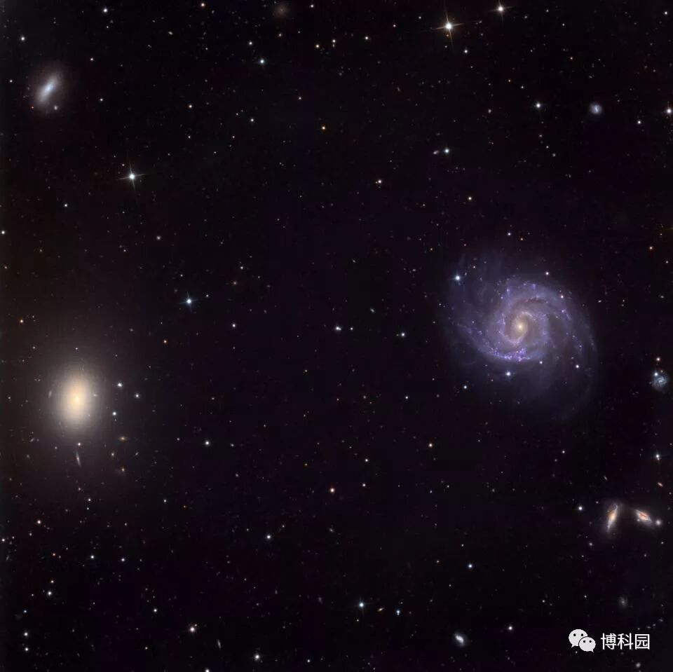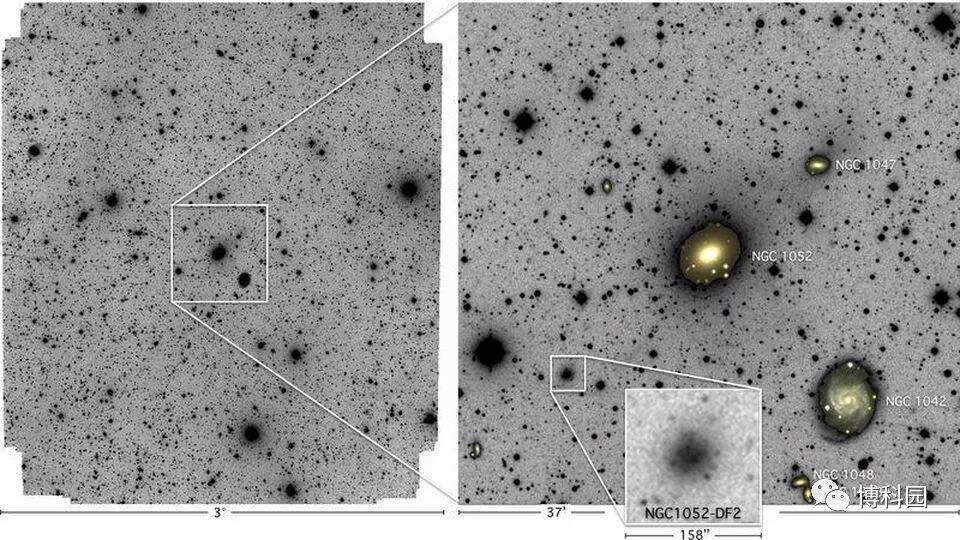 (图3)巨大的椭圆星系NGC 1052(左图)占据了它的一部分,尽管存在许多其他大型星系。在附近一个微小肉眼可见的超弥散星系(简称NGC 1052-DF2)(简称DF2)似乎是由正常物质组成。