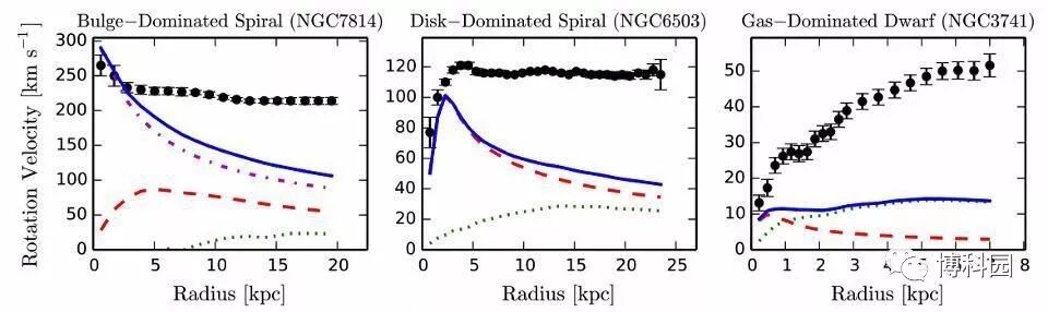 (图11)观察到的曲线(黑点)和总正常物质(蓝色曲线)以及恒星和气体的各种组成部分,有助于星系的旋转曲线。修正后的重力和暗物质都可以解释这些旋转曲线,但是一个没有暗物质的星系遵循着未经修改的重力规则,现在挑战了修正的牛顿动力学(MOND)。